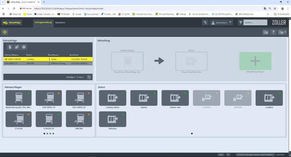 Job management for »coraLogistic« provides a user-friendly interface for end users, allowing them to manage transport orders easily and efficiently. The user interface allows users to select the trolleys and target machines required to carry out the transport order. By clearly displaying the available options, users can quickly select the most suitable vehicles and target machines for their specific requirements.