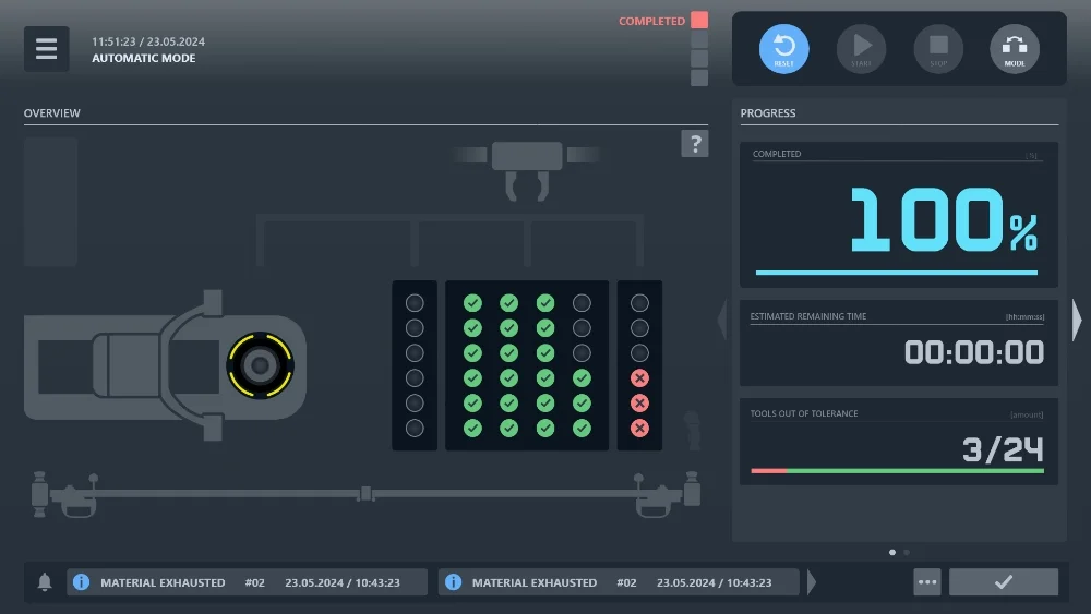 Each of the automation cells is controlled via the intelligent »coraMeasure LG user interface«(start, stop, pause). This convenient user interface also provides a clear overview of status, progress and error management. Furthermore, analysis tools show, for example, the number of tools per day or the number of reject tools. The user interface is also equipped with preventive maintenance: every movement and every stroke is tracked and counted so that necessary maintenance measures can be initiated automatically before the individual components break or unpleasant downtimes occur.