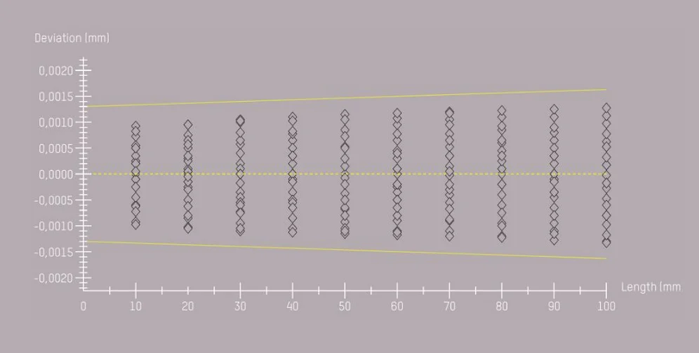 The demands in quality management are constantly increasing. That is why you must be able to rely on the constant measuring deviations of your machines. In ZOLLER measuring machines, high-precision calibration standards made of Borofloatglas® are used to determine the length measurement deviations in accordance with the DIN EN ISO 10360 standard. In accordance with this standard, at least three measuring sequences (25,326 relationships) are carried out. With this procedure, the accuracy of the ZOLLER measuring machines is documented in two dimensions and can be traced at any time.
