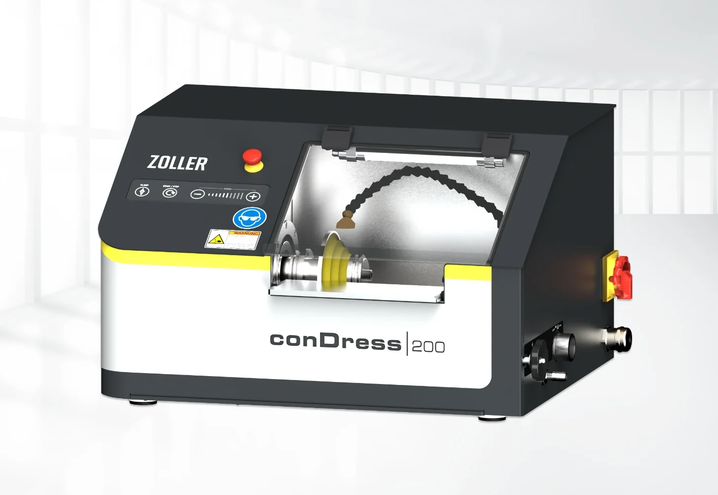 The ZOLLER »conDress 200« dressing device has been specially developed for cleaning and restoring the cutting ability of stone processing tools. A dressing rod is manually pressed against the rotating tool. The rotation speed can be infinitely adjusted, allowing optimum adaptation to different types of tools.