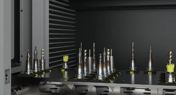 Liftsystem Kardex Shuttle – stellt die Werkzeuge aus dem Werkzeuglager zur Verfügung. Über Tablare, die mit ZOLLER-Traggestellen belegt sind, werden die Werkzeuge aus dem Liftsystem ausgelagert und mit der Automatisierungsanlage »loadBox« kommissioniert.