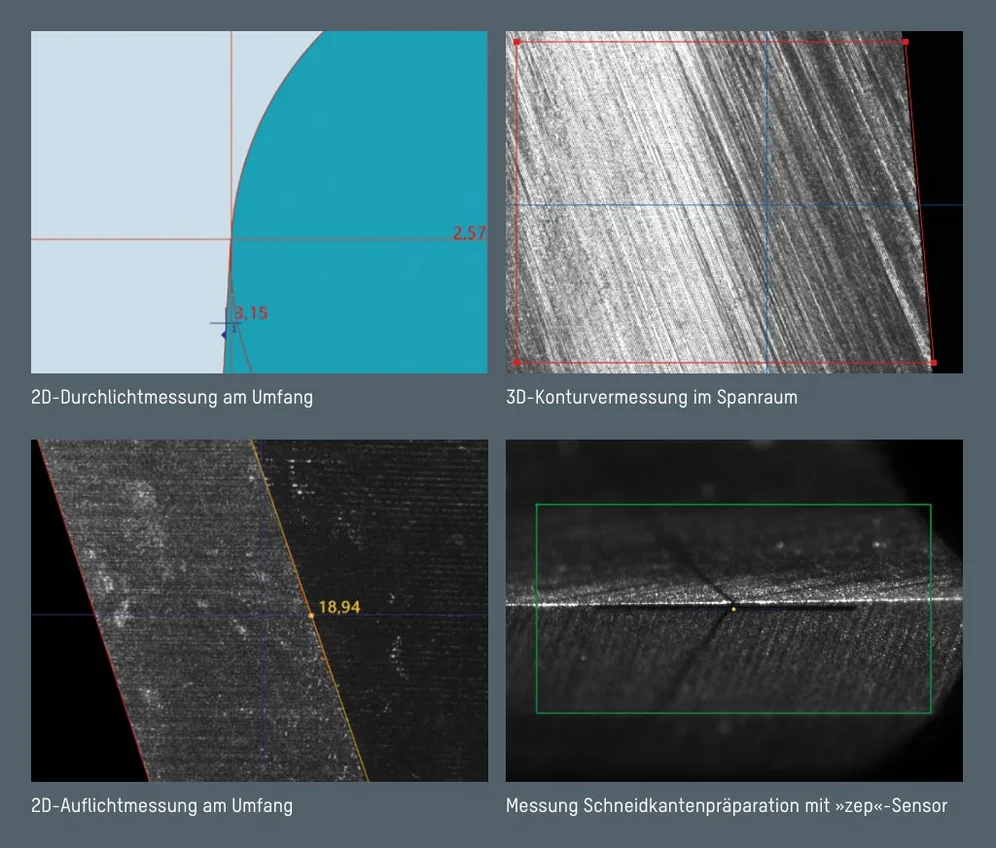 Auflichtkamera mit Multi-LED-Segment-Beleuchtung und CNC-Schwenkeinrichtung – zur Inspektion und automatischen Messung von Werkzeuggeometrien am Umfang, im Spanraum und an der Stirn. Einfach die Sollparameter im Messprogrammdialog eingeben und jede Messgröße wird automatisch gemessen und protokolliert: Spanwinkel, Freiwinkel, Nutkontur, Fasenbreite und viele weitere Geometrien. Die in acht Bereiche segmentierten Hochleistungs-LEDs werden automatisch vom Messsystem gesteuert und gewährleisten durch die automatische Intensitätsregelung eine optimale Ausleuchtung der Oberfläche – für hohe Präzision und Wiederholgenauigkeit. Die Ausstattung der Sensorik ist konfigurierbar.