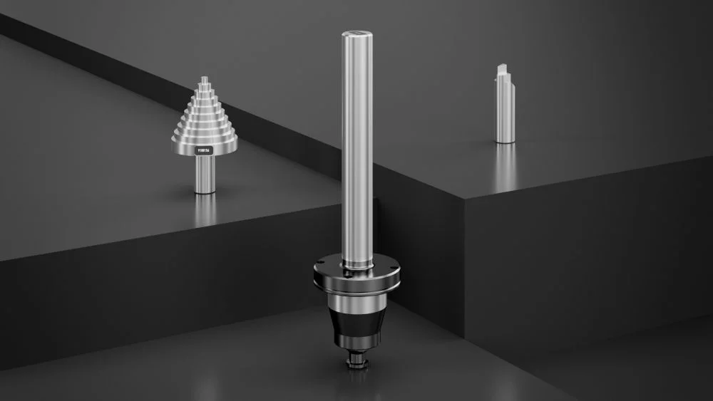 Das integrierte Längeneinstellsystem dient zur Einstellung der Gesamtlänge oder Auskraglänge und zum Werkzeugtausch. Die pneumatisch aktivierte Schnellverstellung und Feinstellung per Handrad ermöglichen schnelles, ergonomisches und präzises Positionieren des Tastkopfes auf die gewünschte Höhe.