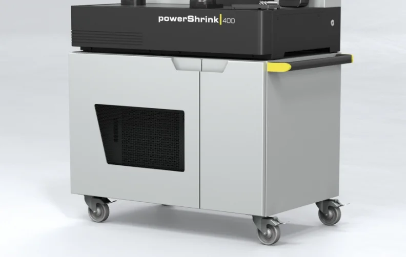 Als Alternative zur Aufstellung auf einer Werkbank kann das »powerShrink 400« auf einem Aufstelltisch mit ergomisch optimaler Arbeitshöhe positioniert werden. In diesem finden Kühler und Rauchgasabsaugung einen aufgeräumten Platz. Optional ist der Aufstelltisch mit stabilen Rollen und ergonomischem Griff erhältlich, um eine variable Positionierung des »powerShrink 400« zu ermöglichen.