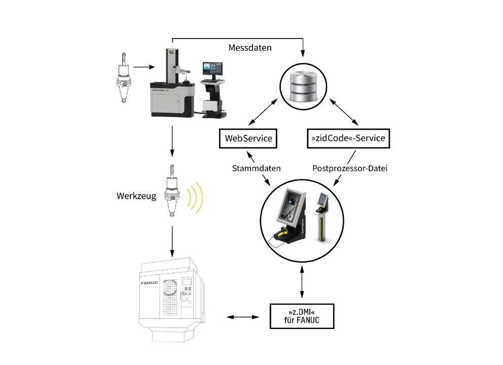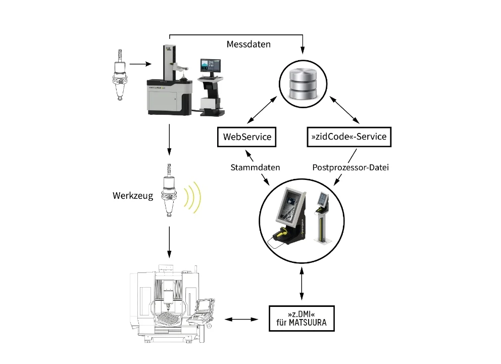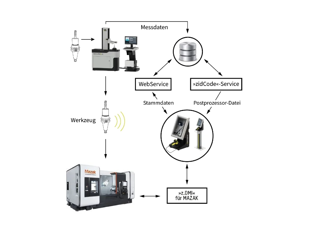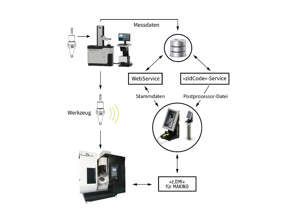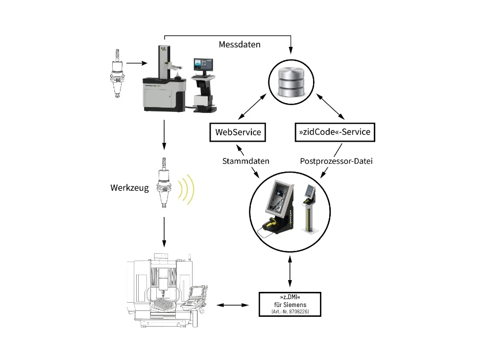 Die ZOLLER »z.DMI«-Technologie ermöglicht die direkte Übertragung der Werkzeugdaten in den Werkzeugspeicher der Maschinensteuerung und zurück in die Datenbank z.One.